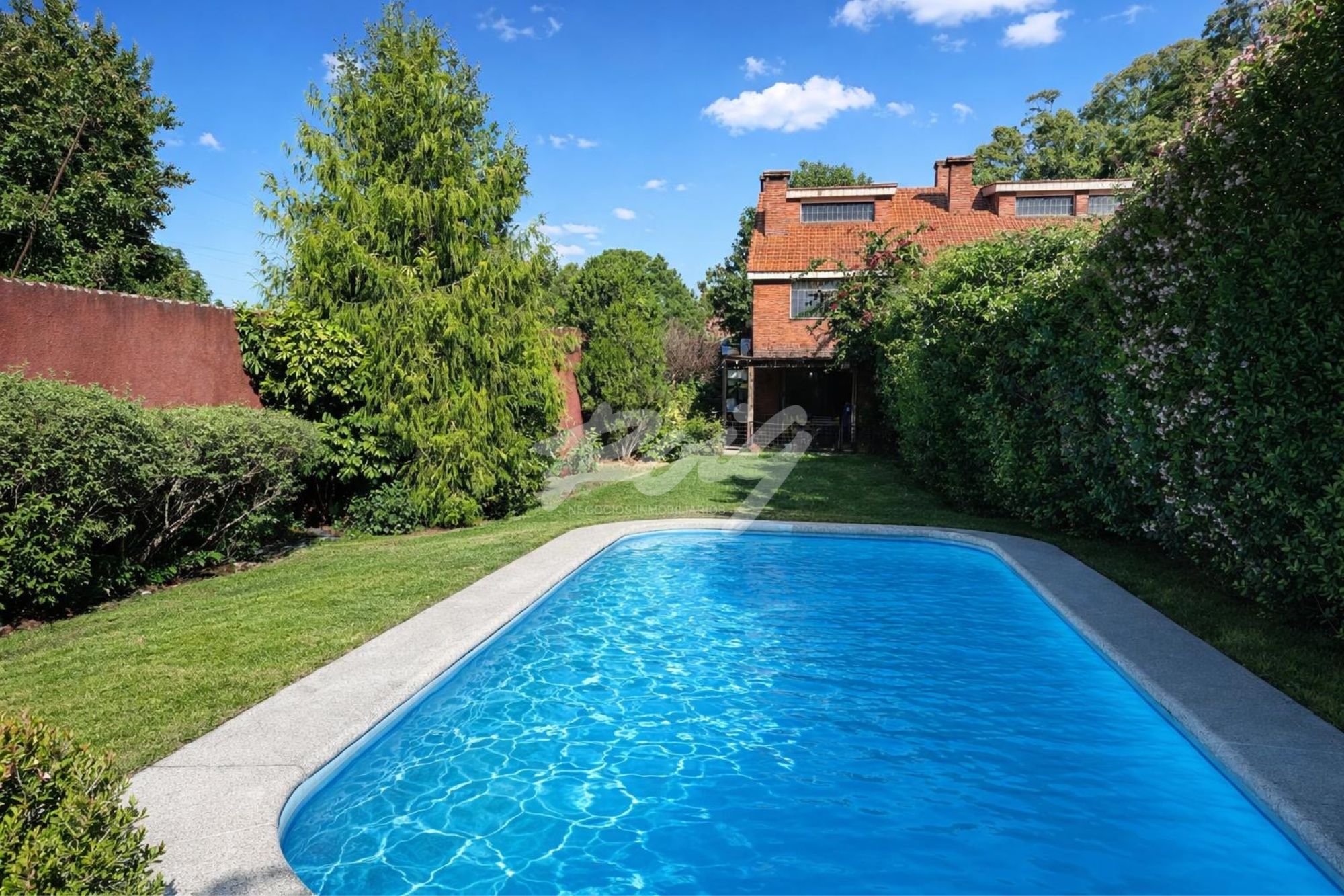 Jardín orientado al noroeste con piscina y galería techada con pergola.
