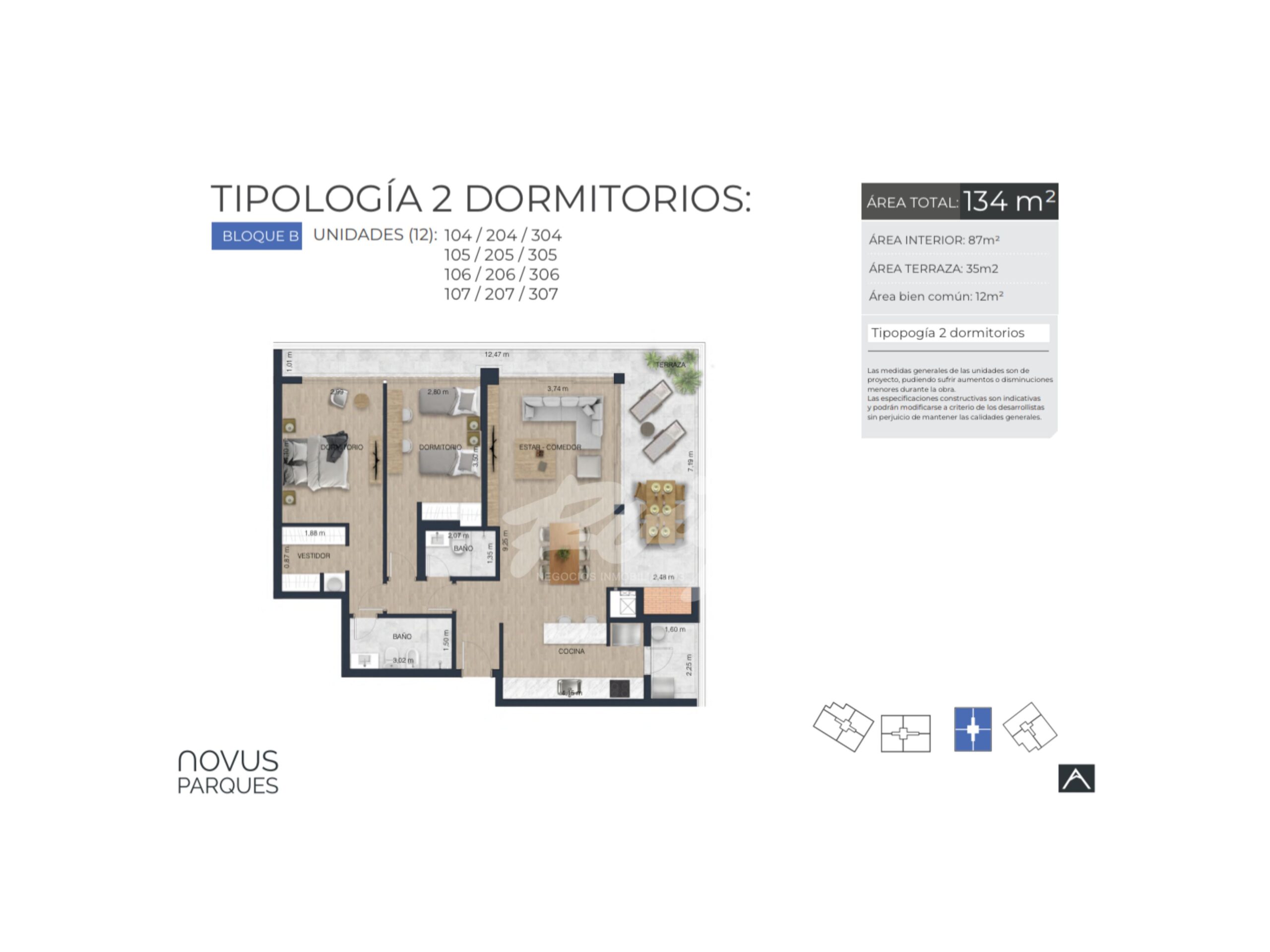 Unidad a estrenar de 134 m2 totales, compuesta por 87m2 interiores, 35 m2 de terraza y 12m2 de áreas comunes.