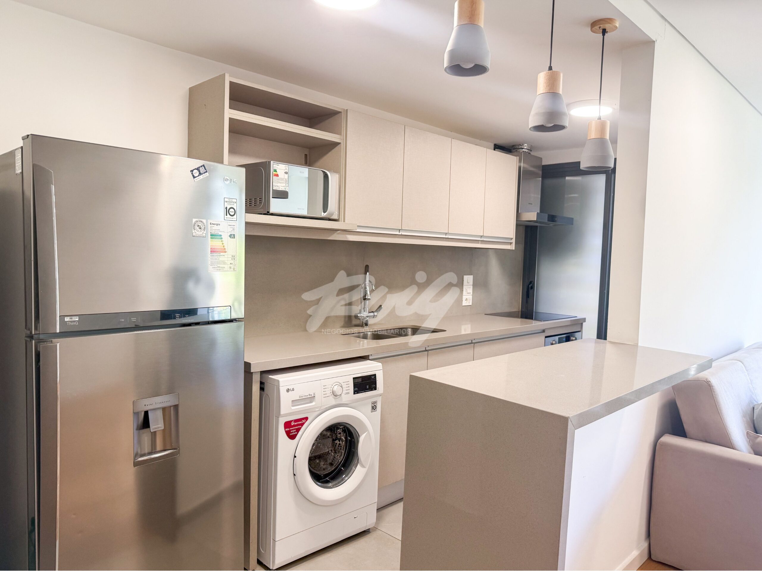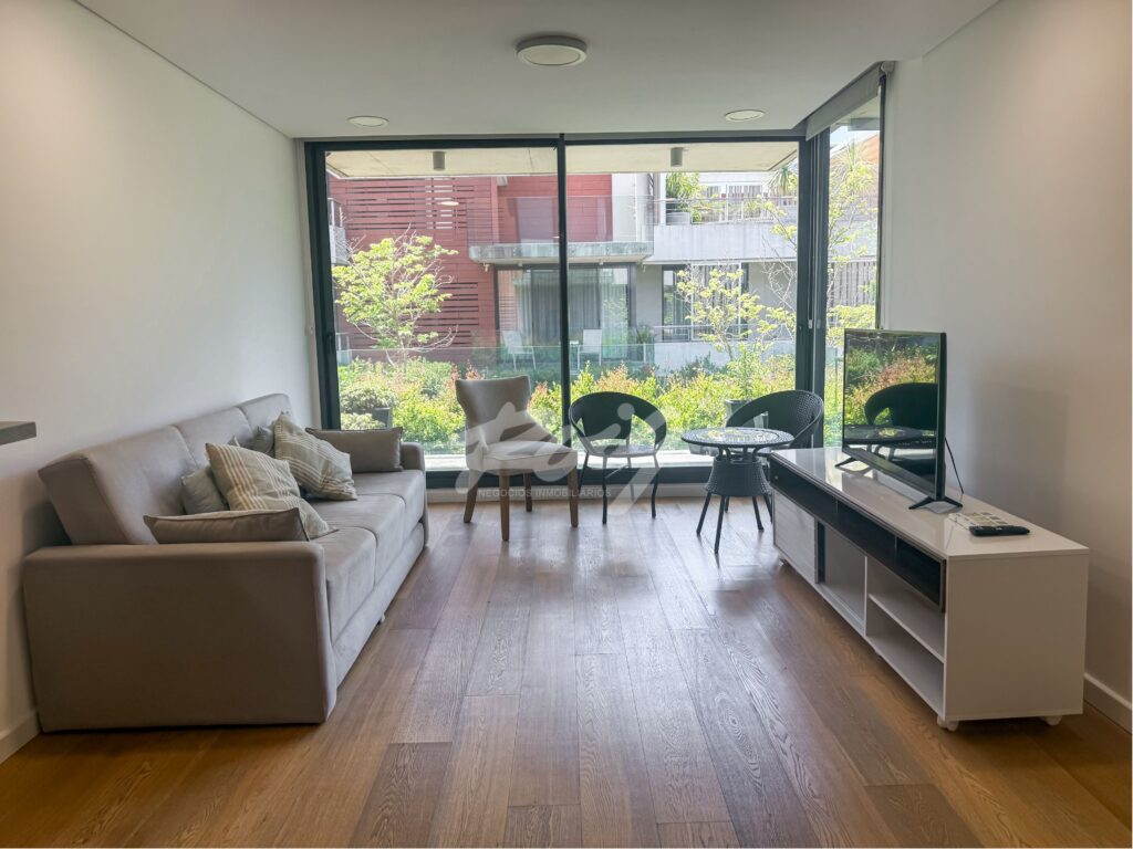 Moderno apartamento con living-comedor con excelente iluminación, equipado con pisos de madera ingenieril y cocina integrada con porcelanato esmaltado, prevista para lavavajillas, lavarropas, secarropas y heladera con toma de agua. Desde el living se accede a una cómoda terraza con parrillero.