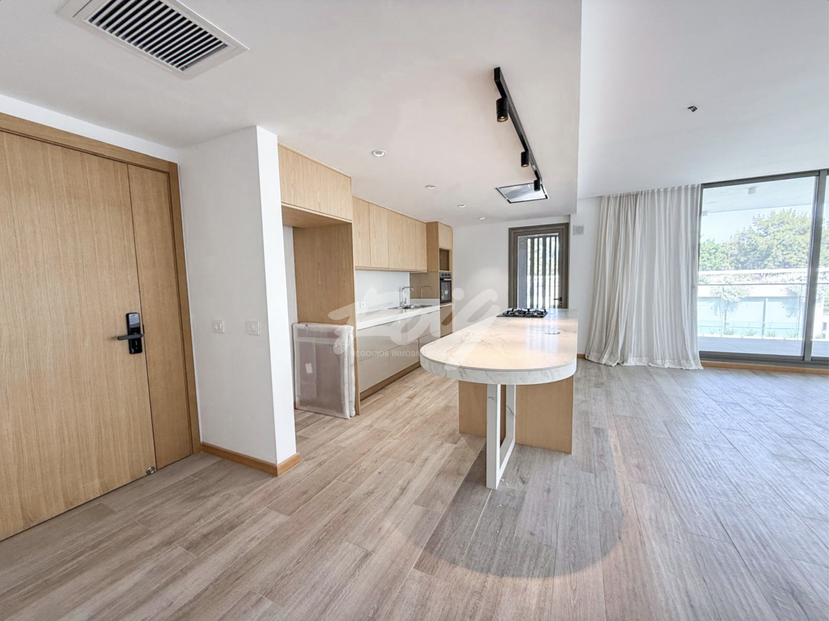 La unidad ofrece un amplio living-comedor con ventanales de piso a techo que aseguran gran luminosidad y salida a una terraza con parrillero propio. Cocina integrada, con una isla central de excelente presencia, muebles en  madera y terminaciones de primera calidad.
