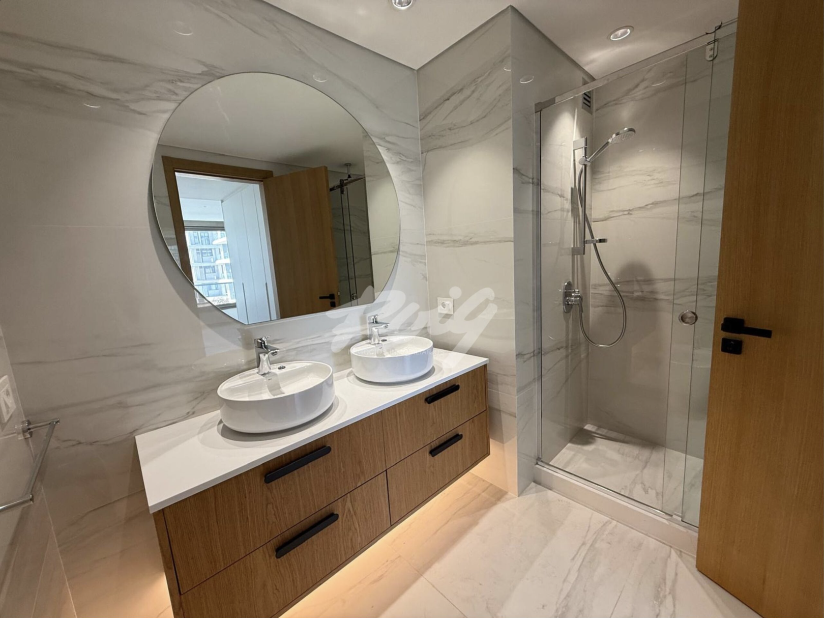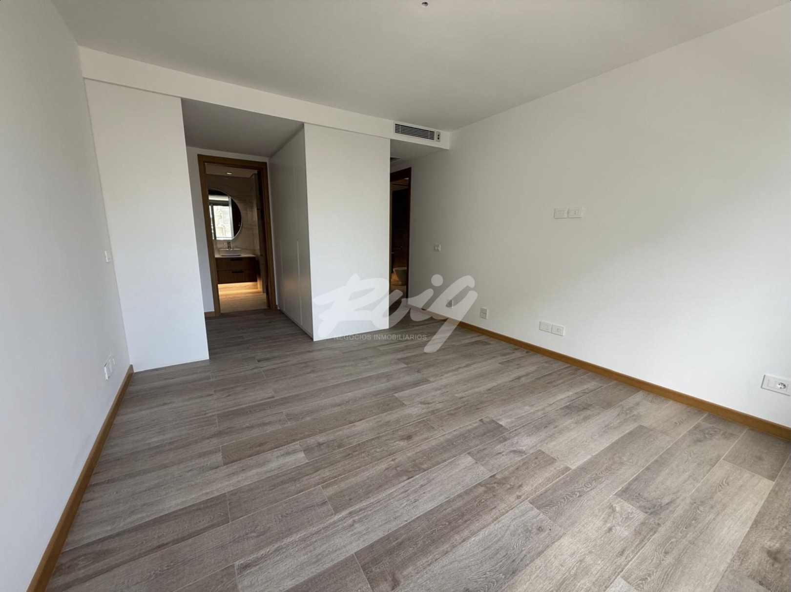 El dormitorio principal cuenta con baño en suite con doble bacha, mampara de vidrio y revestimiento tipo mármol, mientras que el segundo dormitorio también posee buenas dimensiones y placares empotrados. Los materiales  utilizados en toda la unidad: pisos símil madera, carpinterías en madera natural, aberturas de alta prestación y baños de diseño.