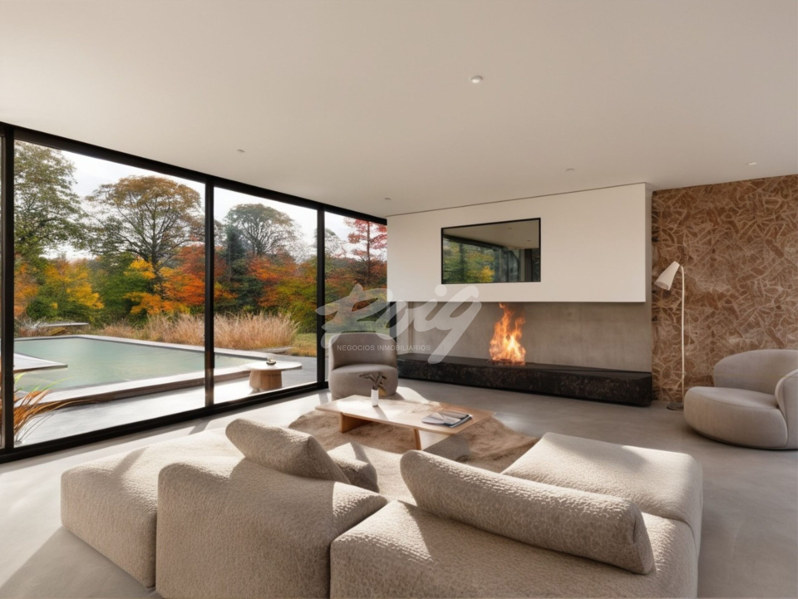 En planta baja cuenta con un living principal vidriado y un estar-comedor independiente, ambos con estufa a leña y salida directa al exterior. Dispone de un escritorio con baño, que puede funcionar como dormitorio en suite. Cocina definida con pasaplatos, área de servicio completa y lavadero. La barbacoa con parrillero se encuentra integrada a la casa.