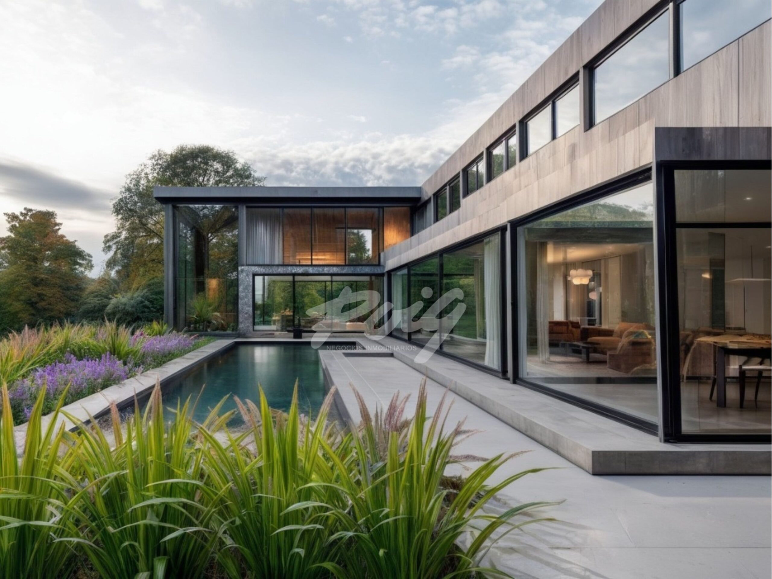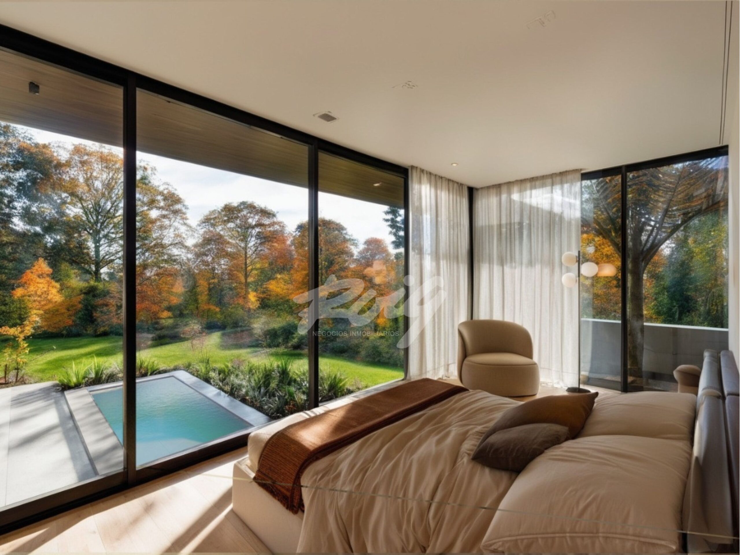 En planta alta se desarrollan 3 dormitorios: un dormitorios principal en suite con vestidor y dos dormitorios adicionales que comparten baño completo. El exterior ofrece un jardín al frente y al fondo con piscina, además de espacio de estacionamiento para varios autos. La casa cuenta con calefacción por losa radiante y aire acondicionado en todos los ambientes.