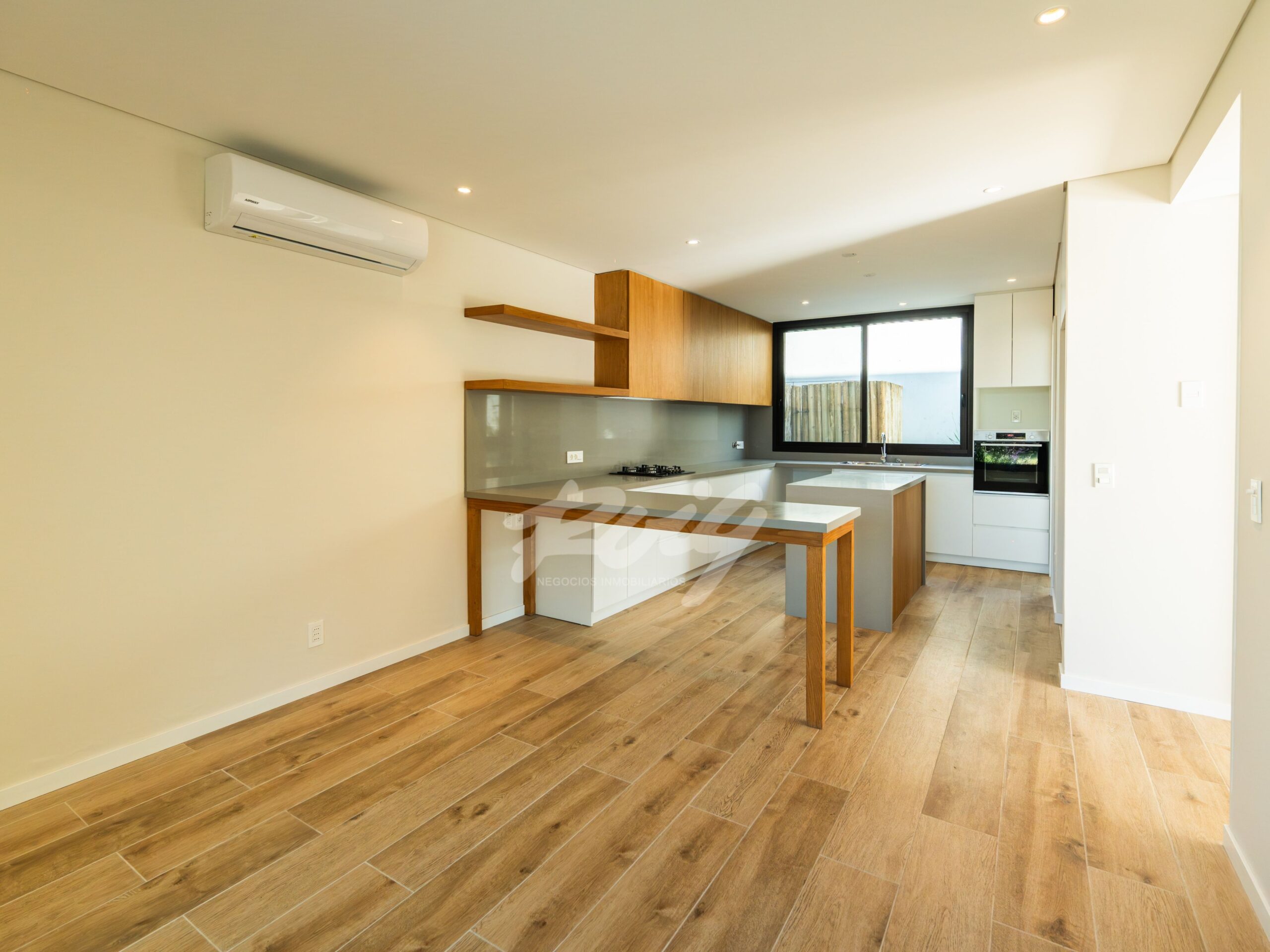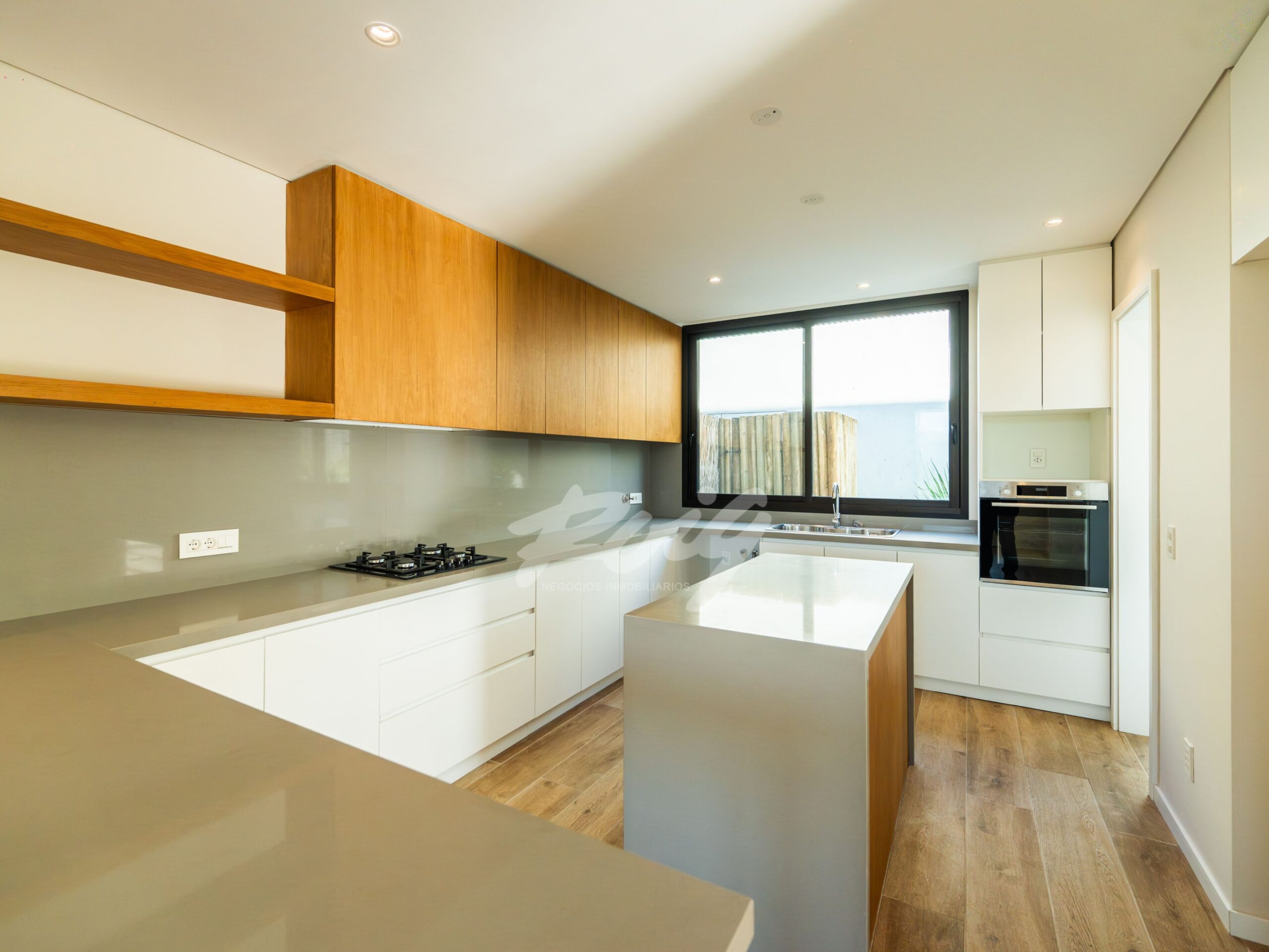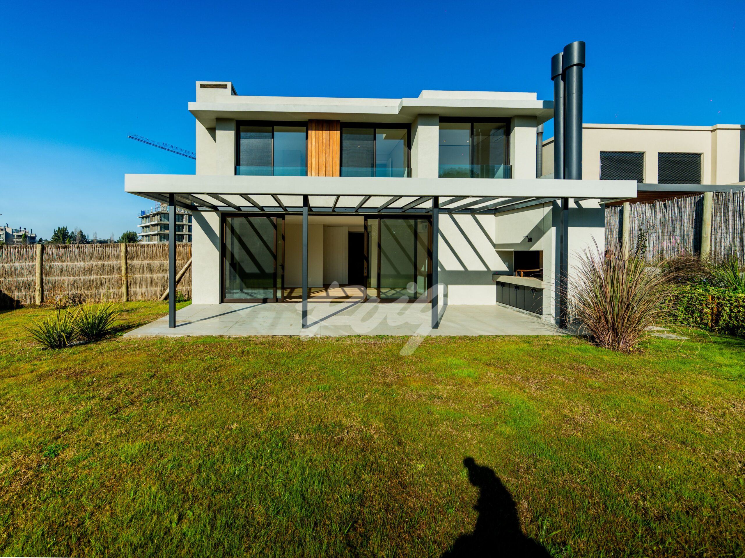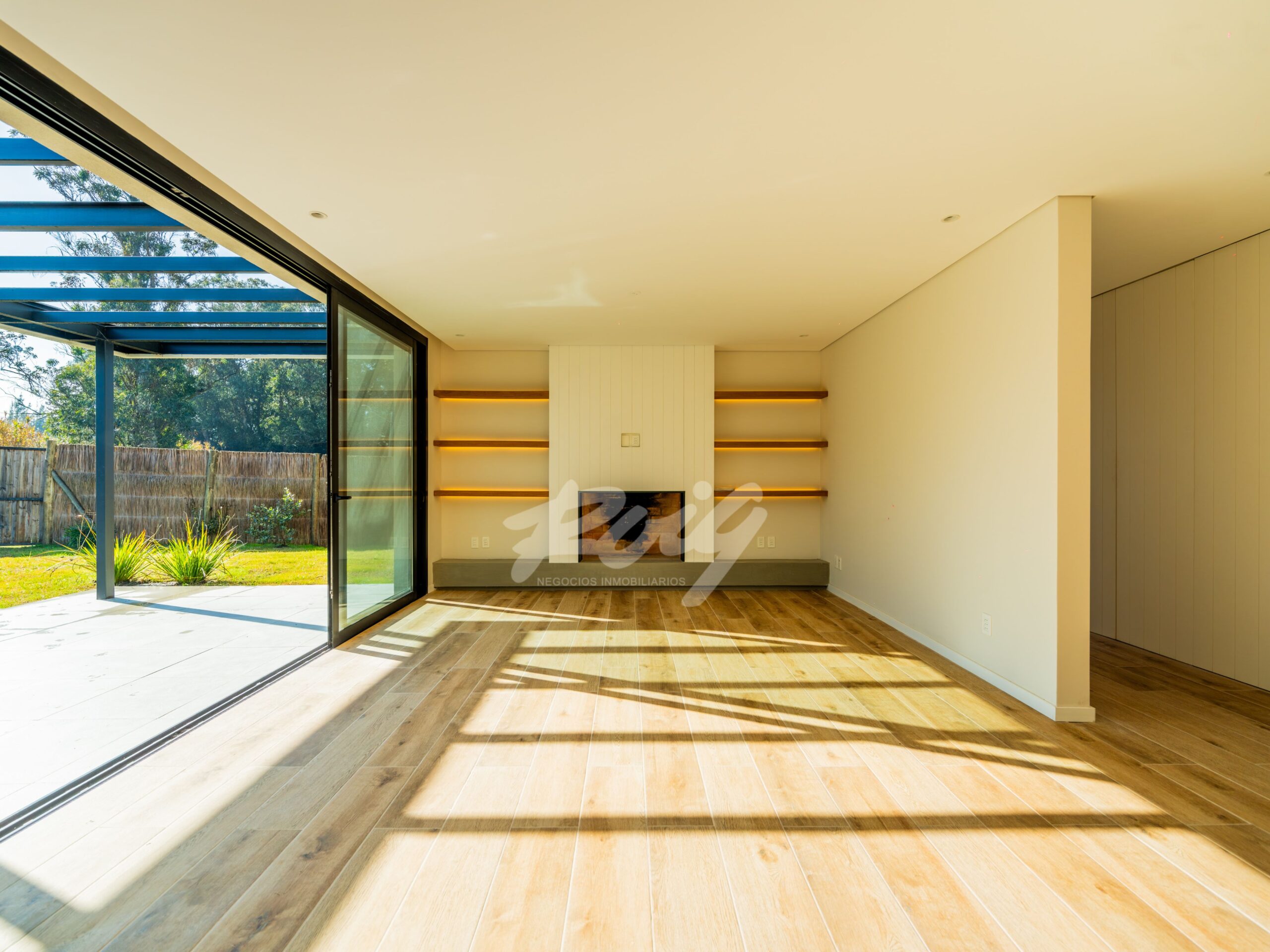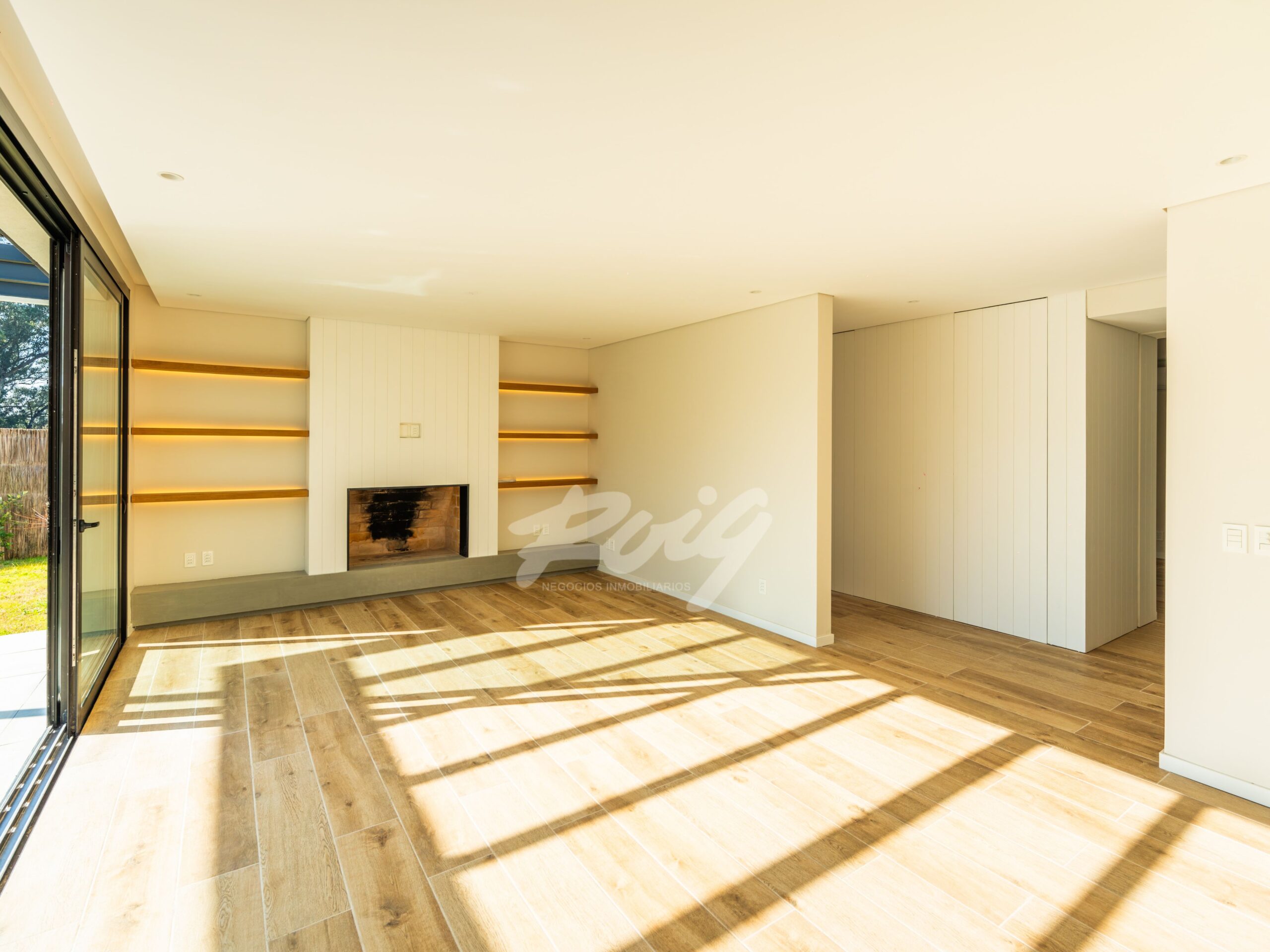 En planta baja, se desarrolla un amplio living-comedor de líneas limpias y detalles de diseño —como estanterías flotantes retroiluminadas y estufa de leña. Estar con cocina integrada. Además, cuarto de servicio con baño y lavadero independiente. En planta alta, 4 dormitorios bien distribuidos: uno de ellos en suite, y tres adicionales que comparten un baño completo.