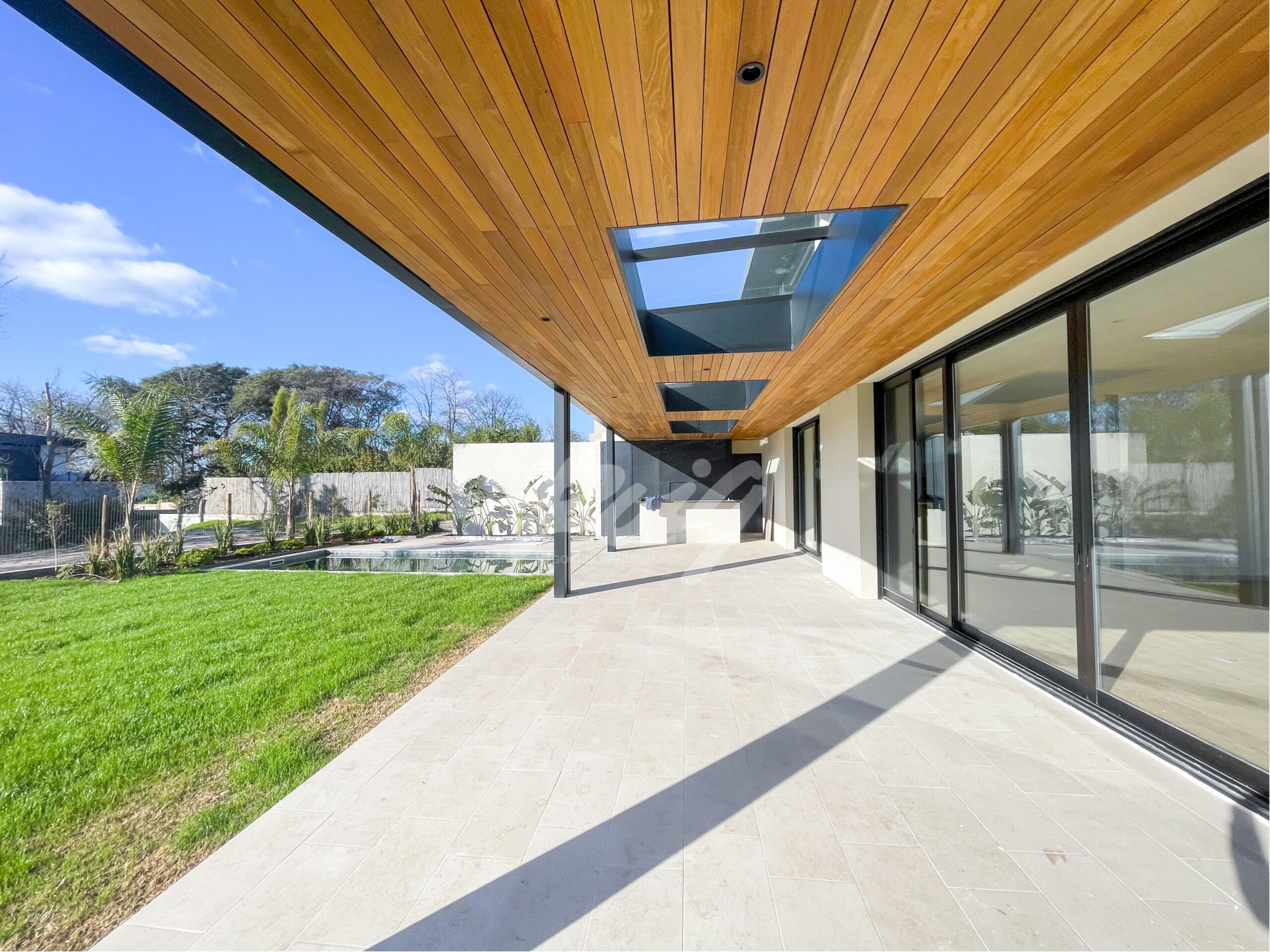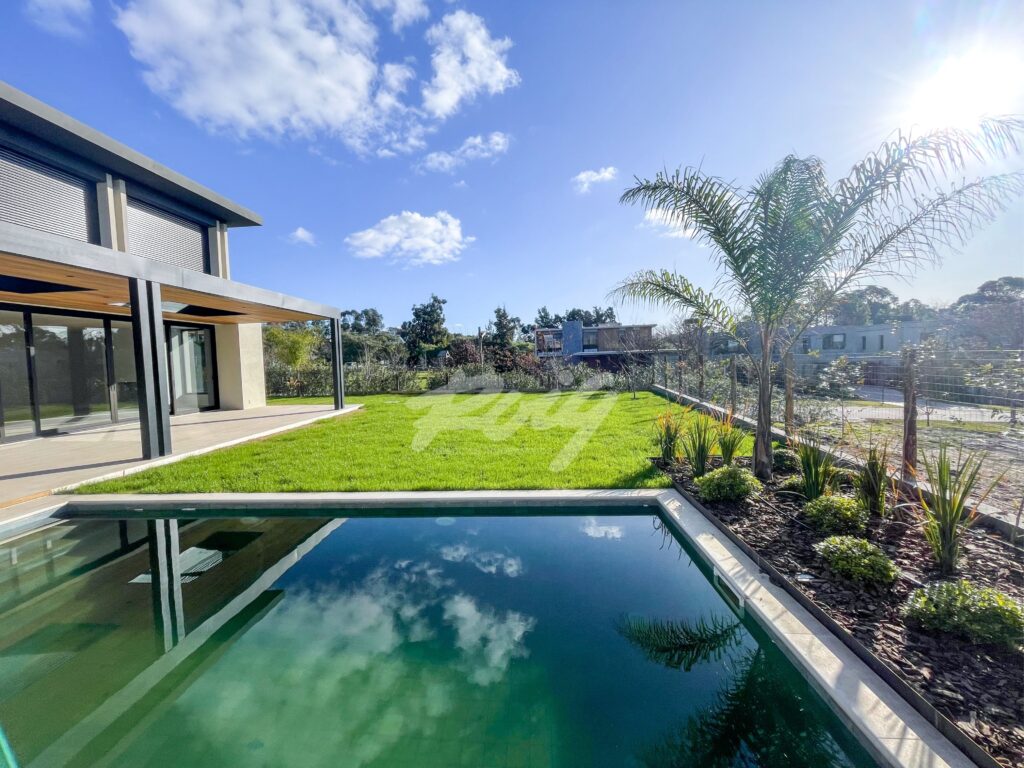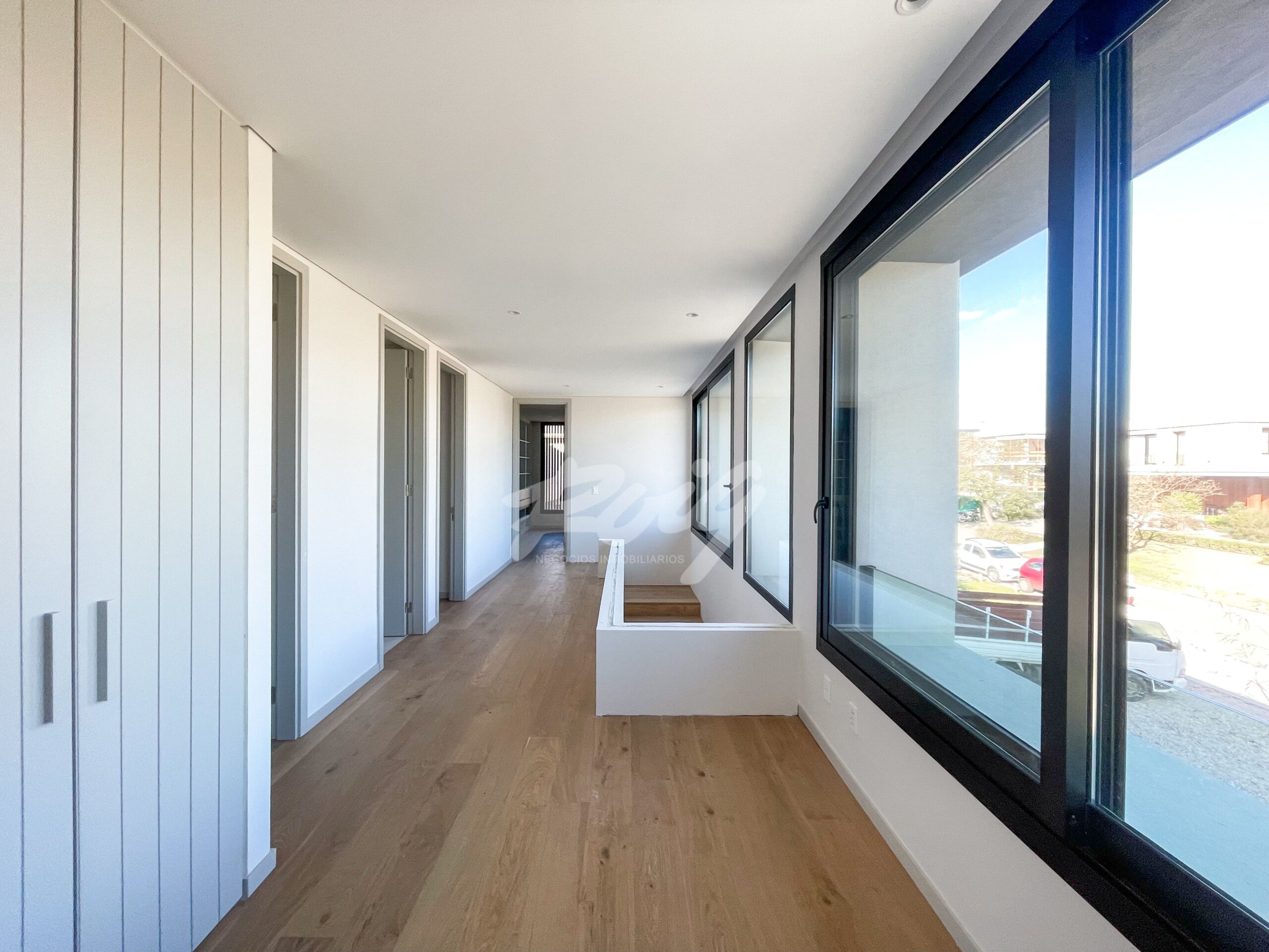 En la planta alta se encuentra un cómodo hall de distribución con placares y 4 dormitorios en suite, dos de ellos con vestidor. El exterior ofrece una terraza techada con parrillero —con acceso tanto desde el living como desde el estar—, piscina climatizada y un jardín totalmente orientado al norte, asegurando sol todo el día.