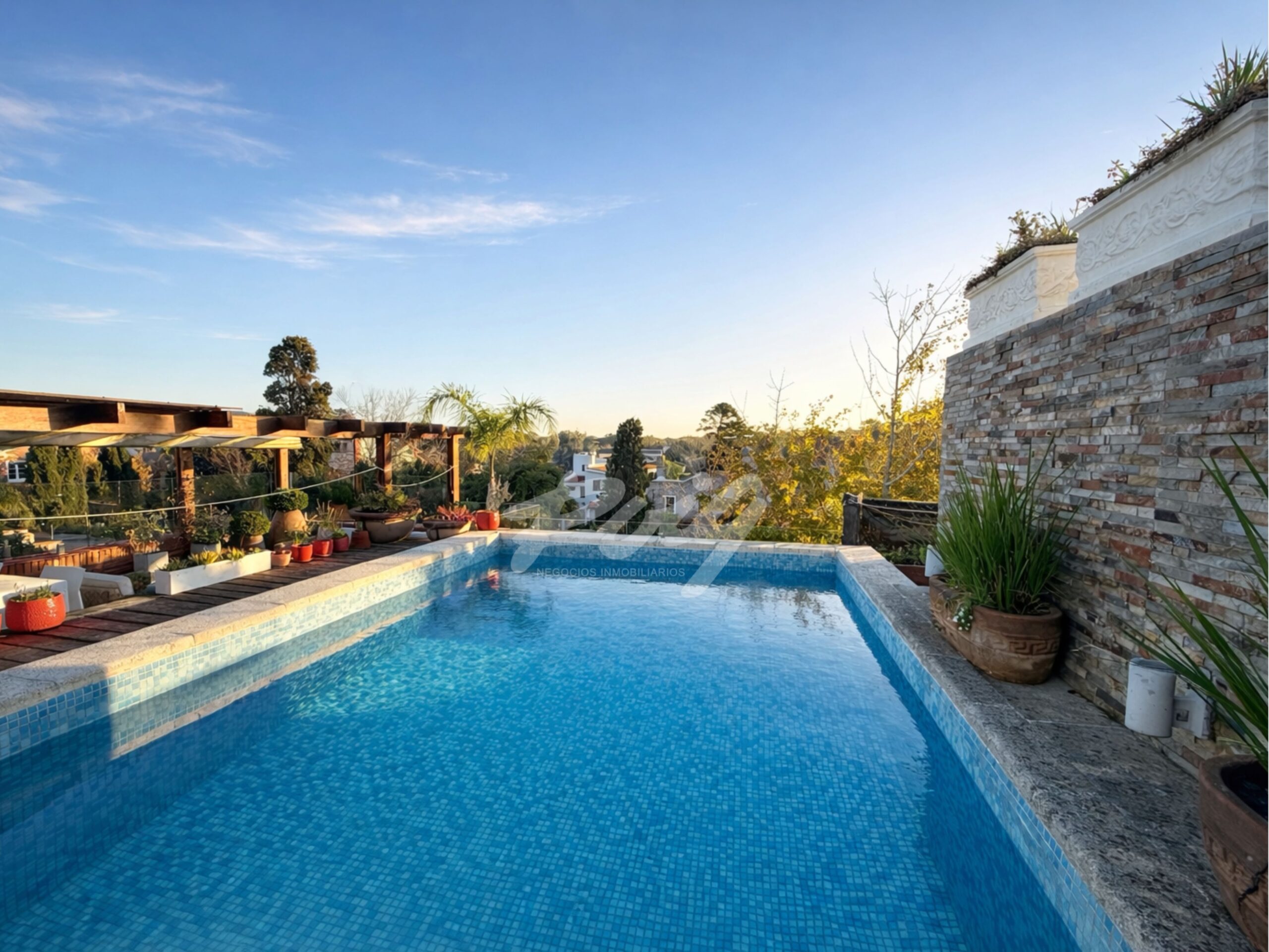 En la planta superior se ubica un gran ambiente, perfecto como playroom, escritorio independiente o gimnasio, además de baño. Desde allí se accede a un espectacular rooftop privado con piscina, deck y parrillero. La propiedad dispone de calefacción por losa radiante eléctrica, servicio de seguridad 24 horas y garaje para dos vehículos.