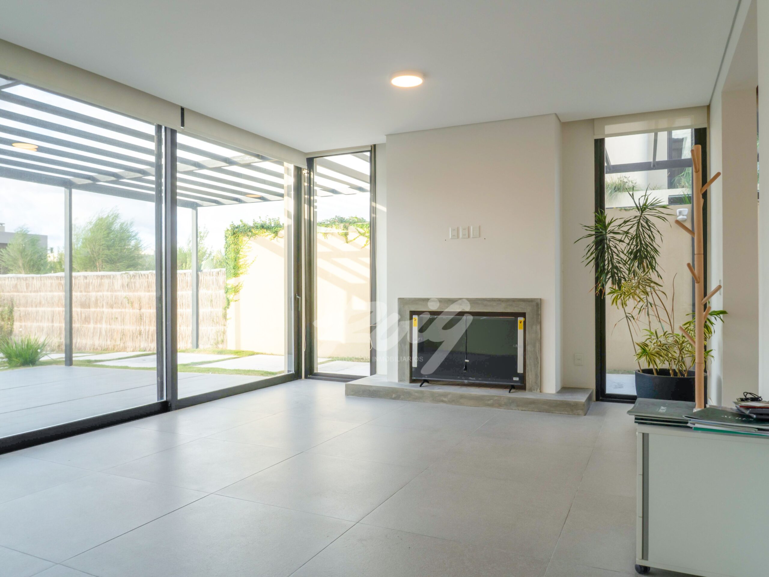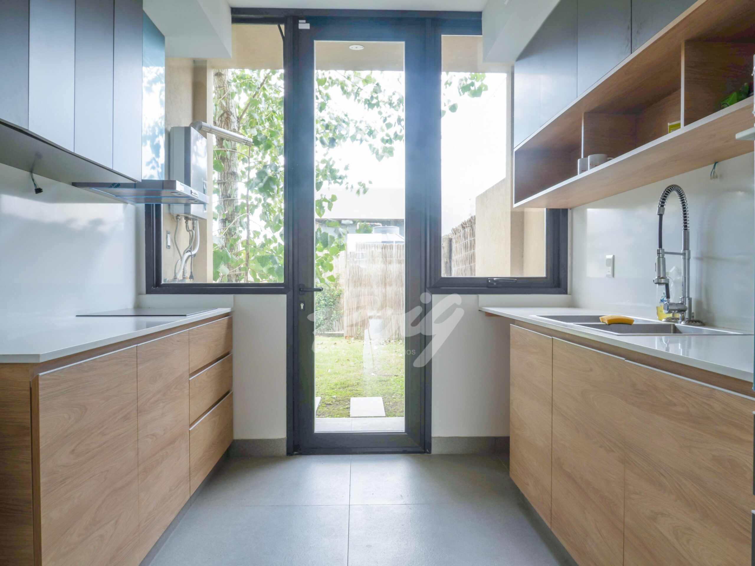Al ingresar nos recibe un hall de entrada que da paso al living – comedor al frente. Se destaca por sus amplios ventanales y cuenta con estufa a leña y salida directa a la terraza con parrillero. Desde el hall también accedemos a un estar, con salida al fondo, ideal como espacio más privado. La cocina es definida, con la posibilidad de integrarse o cerrarse mediante puerta corrediza. Se encuentra equipada con horno, anafe y campana, y dispone con acceso independiente. Se ubica además un toilette de visitas y un práctico espacio de guardado bajo escalera.